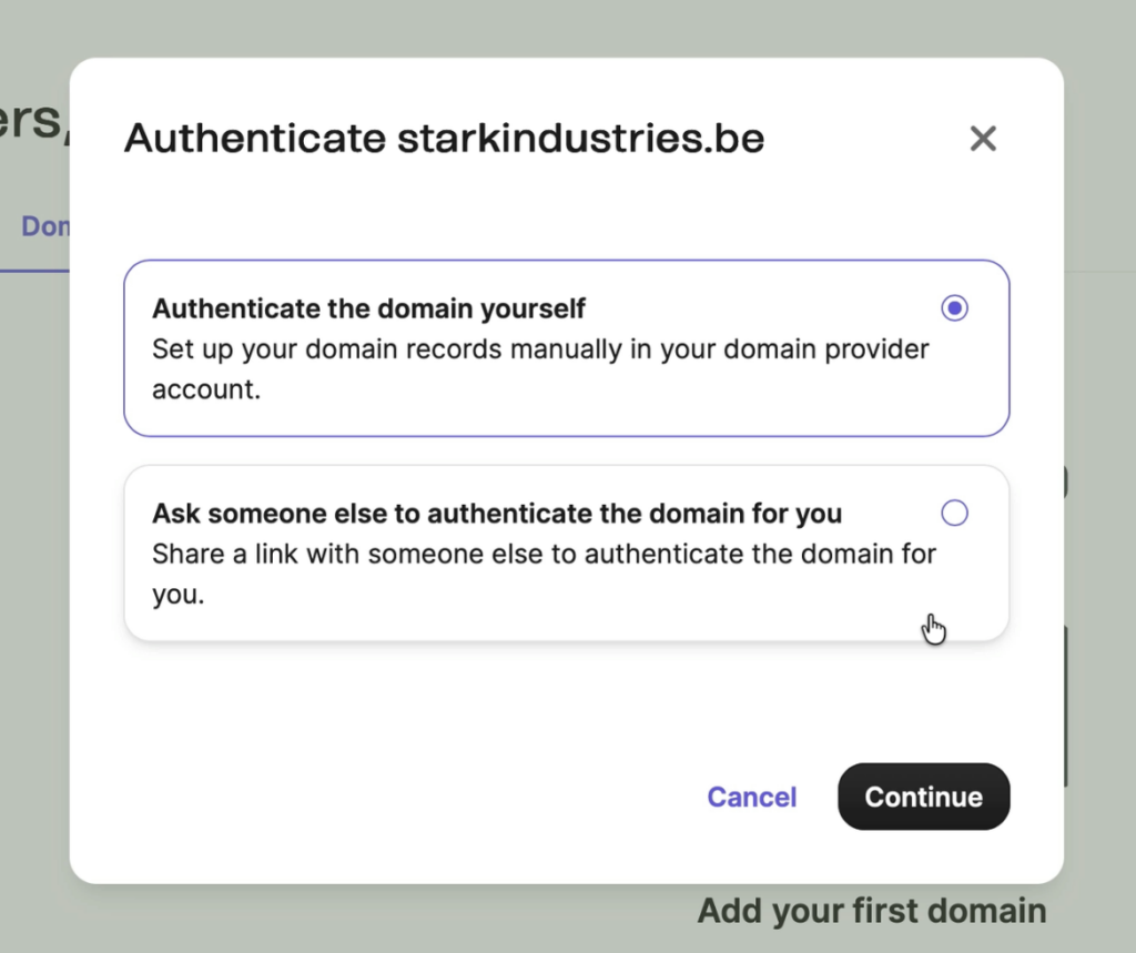 Geef vervolgens je domeinnaam in en kies voor ‘Authenticate the domain yourself’.