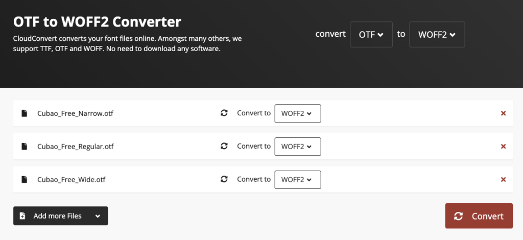Download eerst het lettertype. Vaak is dit in de vorm van een otf-bestand. Aangezien die bestanden vrij zwaar zijn, is het aangeraden om het font eerst te converteren naar een .woff2 bestand. Dit kan eenvoudig via een tool zoals CloudConvert.