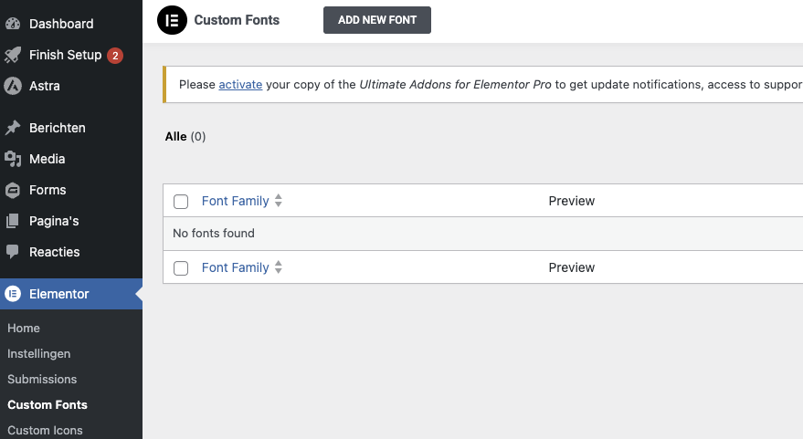 In je WordPress dashboard klik je onder ‘Elementor’ op ‘Custom Fonts’.