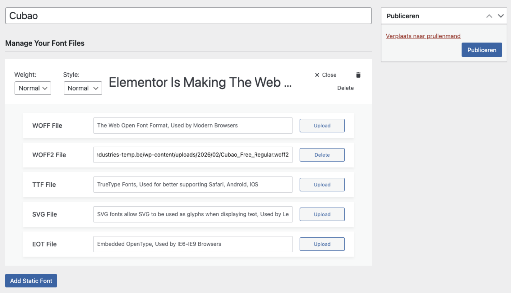Klik op ‘Add new font’ en geef je font een naam. Klik vervolgens op ‘Add Static Font’ om de variaties in te stellen. Upload ook het bijbehorende .woff2 bestand. Stel dat je een variant hebt in meerdere stijlen (normal/italic/oblique) en meerdere weights (Bold/100/200/300/…) dan dien je voor elke variatie een nieuw static font toe te voegen.