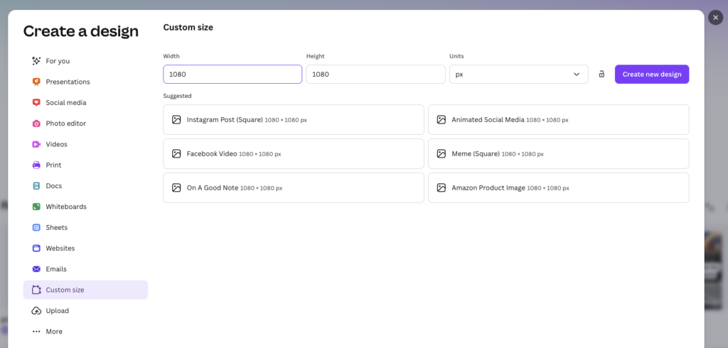 Log in op Canva en maak een nieuw design aan. Kies voor ‘Custom size’ en kies een width en height van 1080. Op zich kan je eender welk formaat gebruiken, maar een vierkant is ideaal aangezien een QR-code ook standaard een vierkant is.