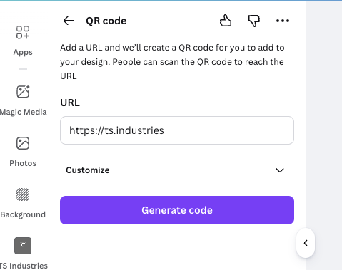 De QR-code wordt nu gegenereerd en in je canvas geplaatst. Maak deze groter zodat deze de volledige ruimte vult.