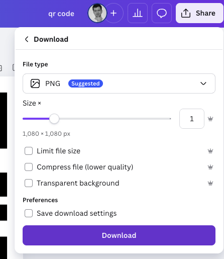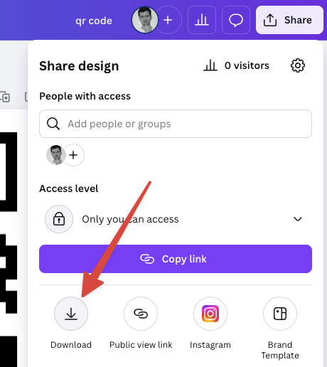 Je kan de QR-code gebruiken in andere Canva-ontwerpen (zoals voor visitekaartjes of flyers), of je kan deze exporteren zodat je deze overal kan gebruiken waar je wenst.